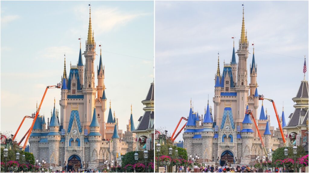 Walking down Main Street, U.S.A. and snapping your perfect castle photo is a hallmark of any Disney trip — but during the repainting, the work will be visible at times. Disney has shared that crews will be working on the castle in the mornings, including using cranes and lifts to reach higher areas. The moat around the castle will even be drained at the start of the project so crews can access lower sections.